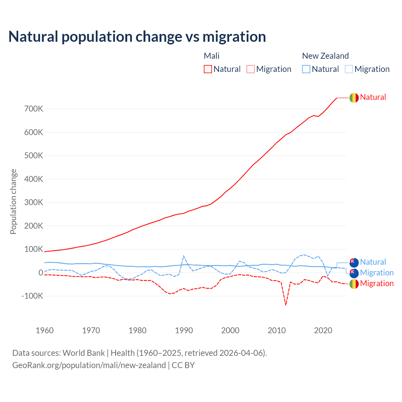 Over the last 10 years, 94.9% of the population change in Mali is from natural causes (a gain of 6,749,473 people) and 5.13% is from migration (a loss of 365,292 people). In New Zealand 34.4% is from natural causes (a gain of 247,767 people) and 65.6% is from migration (a gain of 471,602 people).