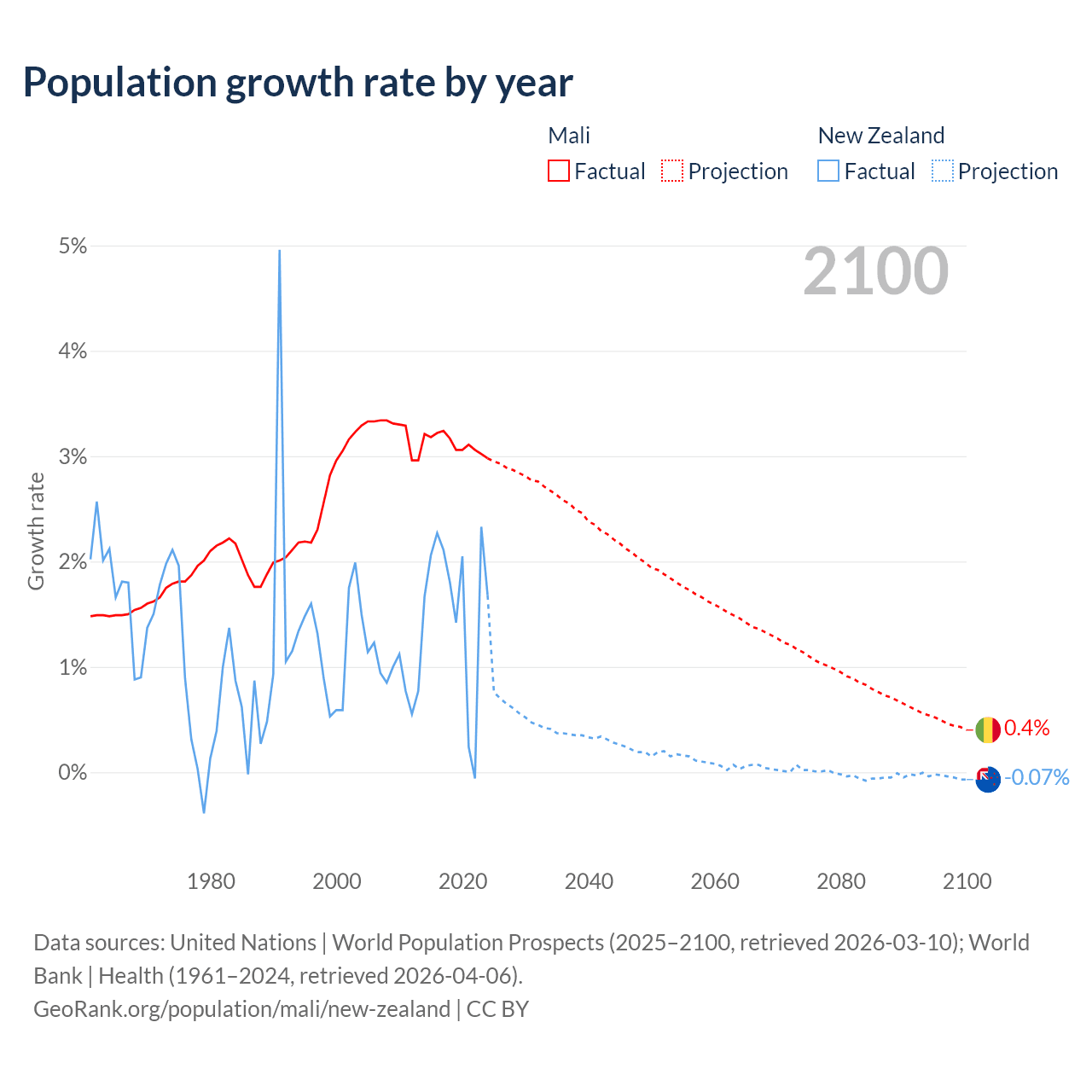 - For the last 10 years, Mali has had an average growth rate of +3.12% per year vs +1.6% in New Zealand.