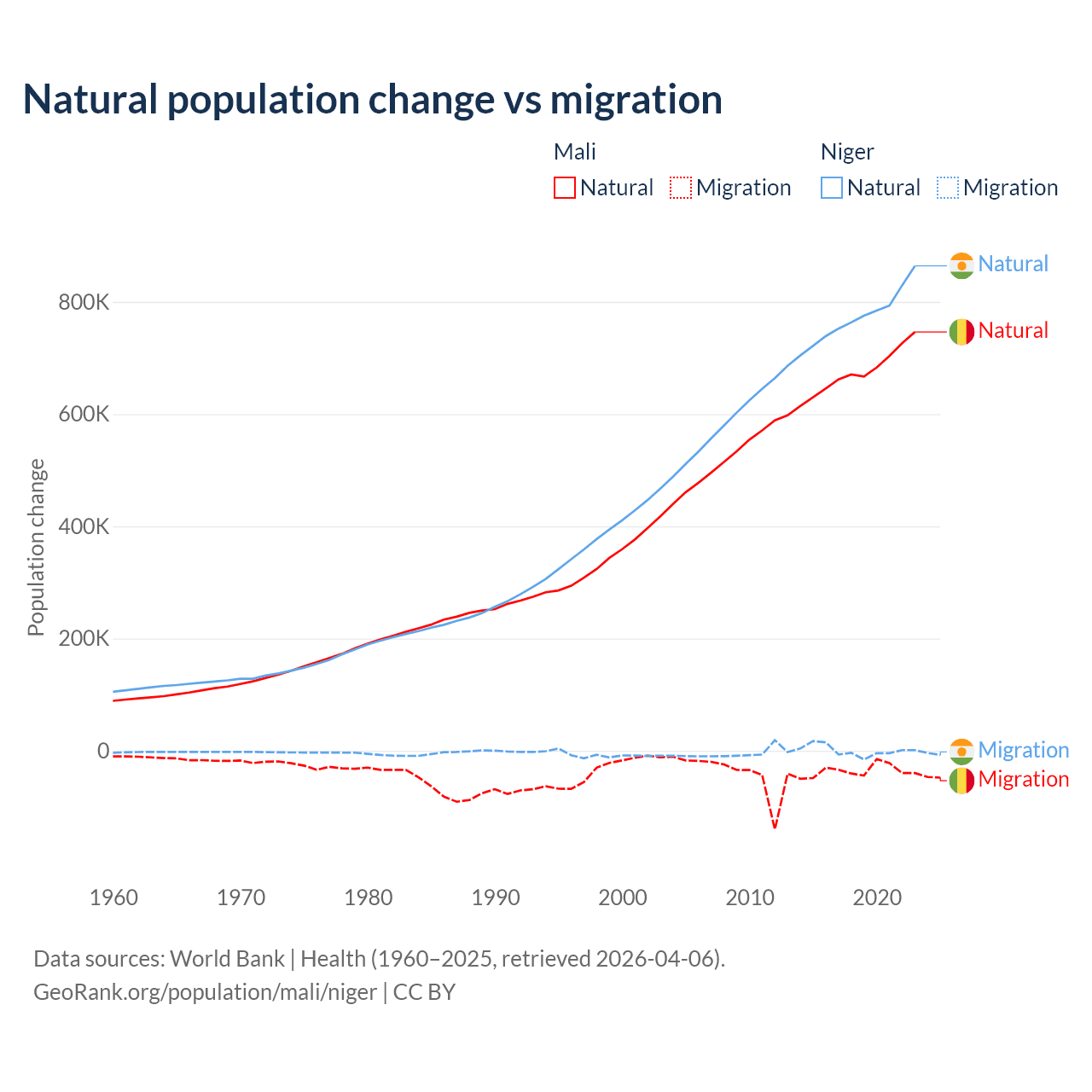 Over the last 10 years, 94.9% of the population change in Mali is from natural causes (a gain of 6,749,473 people) and 5.13% is from migration (a loss of 365,292 people). In Niger 100% is from natural causes (a gain of 7,728,287 people) and 0.03% is from migration (a gain of 2,520 people).