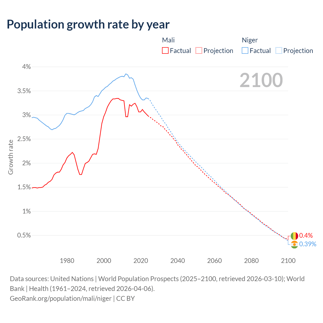 - For the last 10 years, Mali has had an average growth rate of +3.12% per year vs +3.5% in Niger.