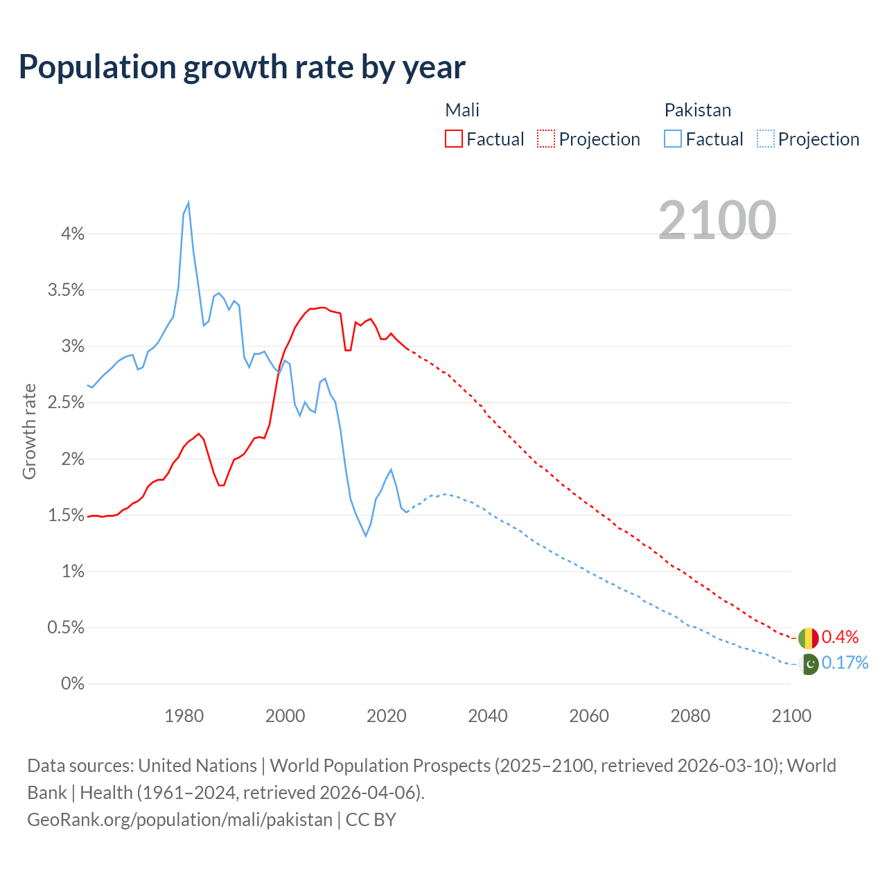 - For the last 10 years, Mali has had an average growth rate of +3.12% per year vs +1.6% in Pakistan.