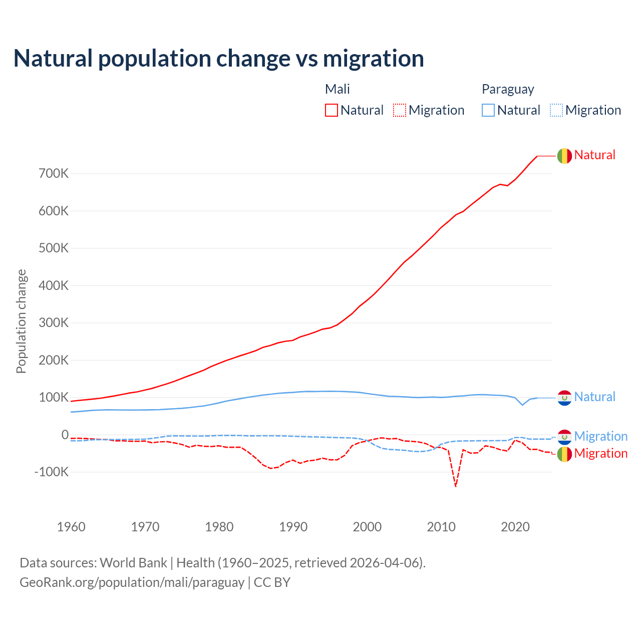 Over the last 10 years, 94.9% of the population change in Mali is from natural causes (a gain of 6,749,473 people) and 5.13% is from migration (a loss of 365,292 people). In Paraguay 87.6% is from natural causes (a gain of 1,002,636 people) and 12.4% is from migration (a loss of 141,377 people).