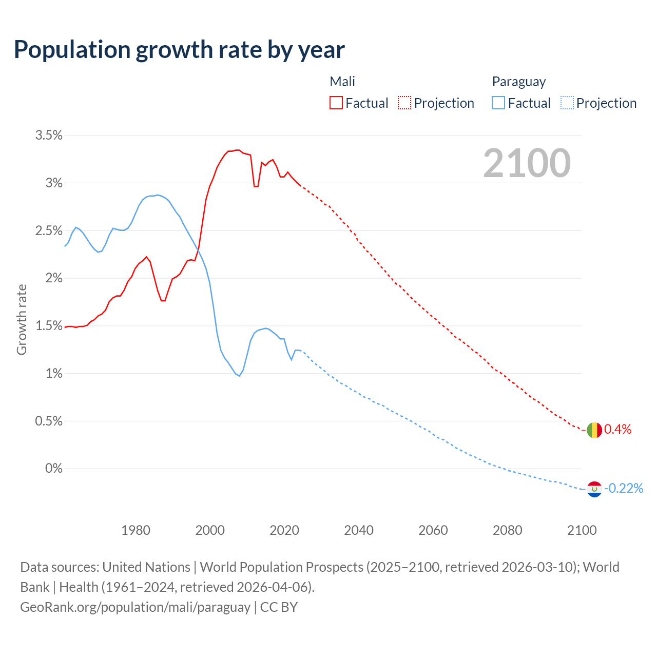 - For the last 10 years, Mali has had an average growth rate of +3.12% per year vs +1.34% in Paraguay.