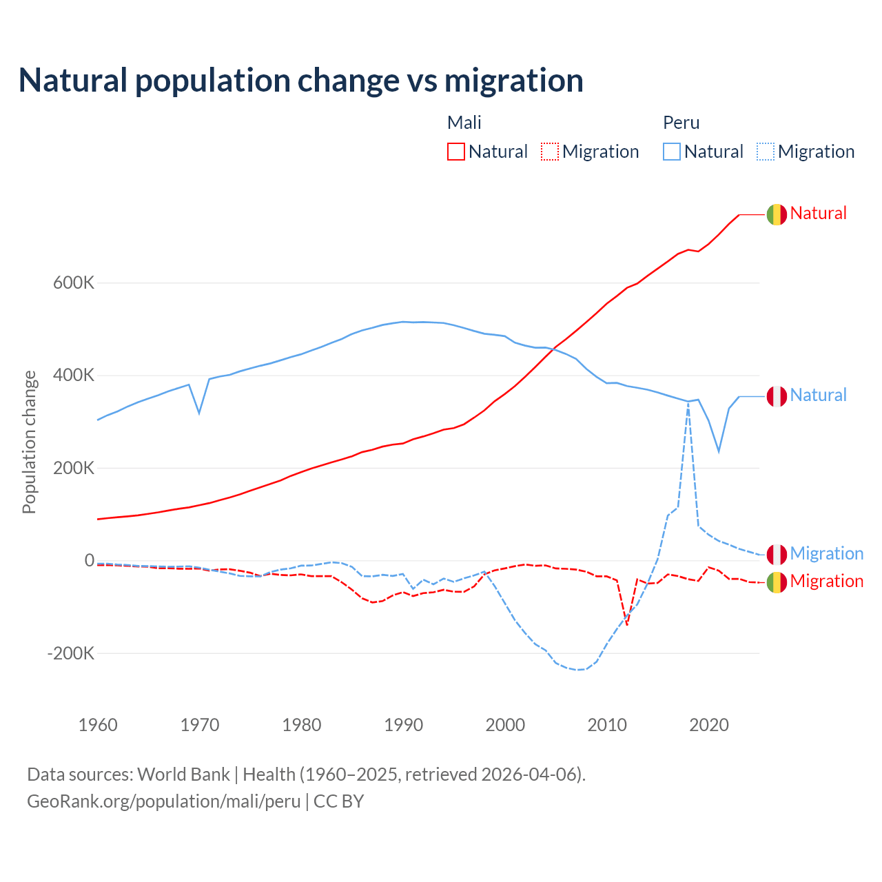 Over the last 10 years, 94.9% of the population change in Mali is from natural causes (a gain of 6,749,473 people) and 5.13% is from migration (a loss of 365,292 people). In Peru 82% is from natural causes (a gain of 3,345,822 people) and 18% is from migration (a gain of 732,505 people).