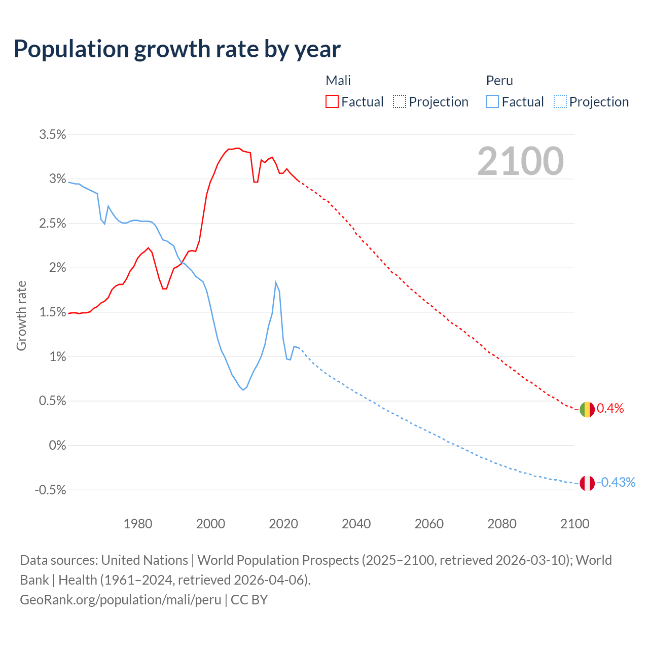 - For the last 10 years, Mali has had an average growth rate of +3.12% per year vs +1.26% in Peru.