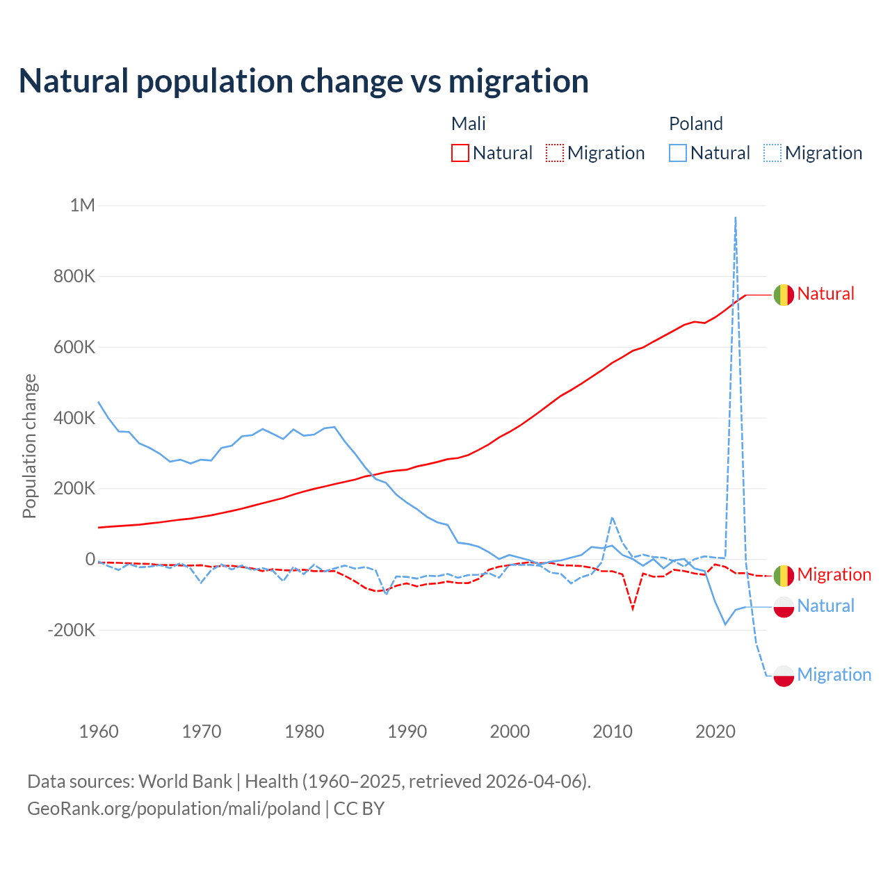Over the last 10 years, 94.9% of the population change in Mali is from natural causes (a gain of 6,749,473 people) and 5.13% is from migration (a loss of 365,292 people). In Poland 41.4% is from natural causes (a loss of 675,443 people) and 58.6% is from migration (a gain of 955,766 people).
