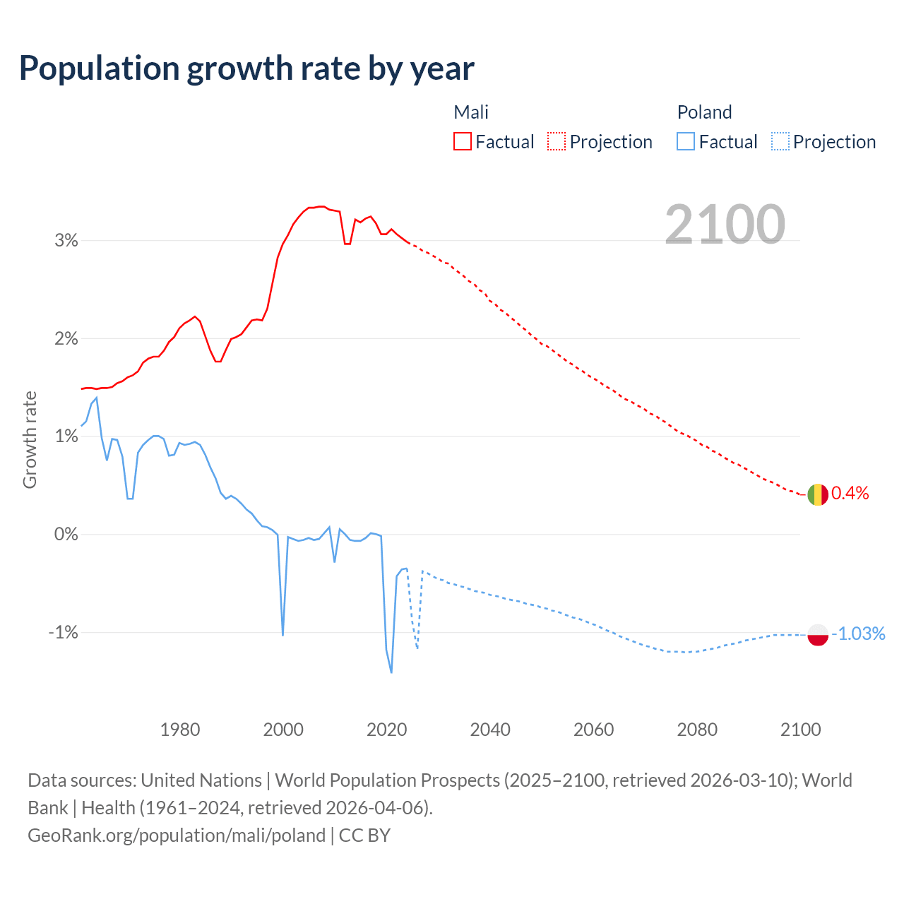 - For the last 10 years, Mali has had an average growth rate of +3.12% per year vs -0.36% in Poland.