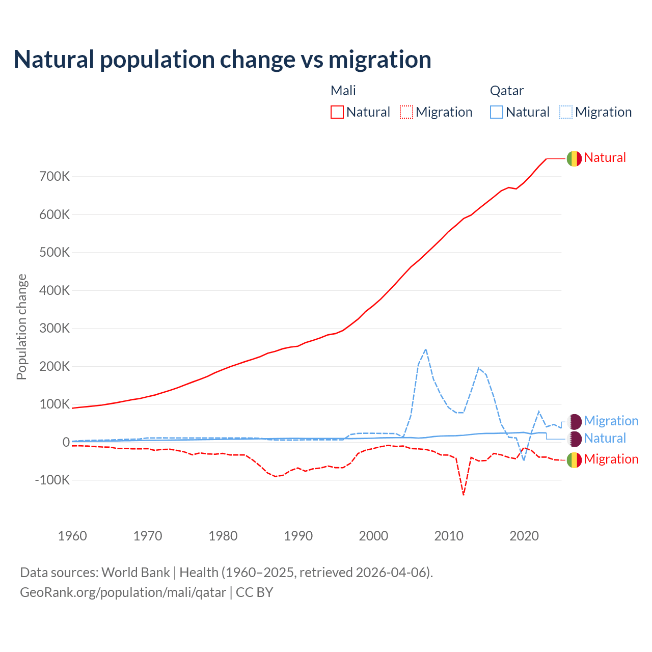 Over the last 10 years, 94.9% of the population change in Mali is from natural causes (a gain of 6,749,473 people) and 5.13% is from migration (a loss of 365,292 people). In Qatar 26.1% is from natural causes (a gain of 232,009 people) and 73.9% is from migration (a gain of 655,712 people).