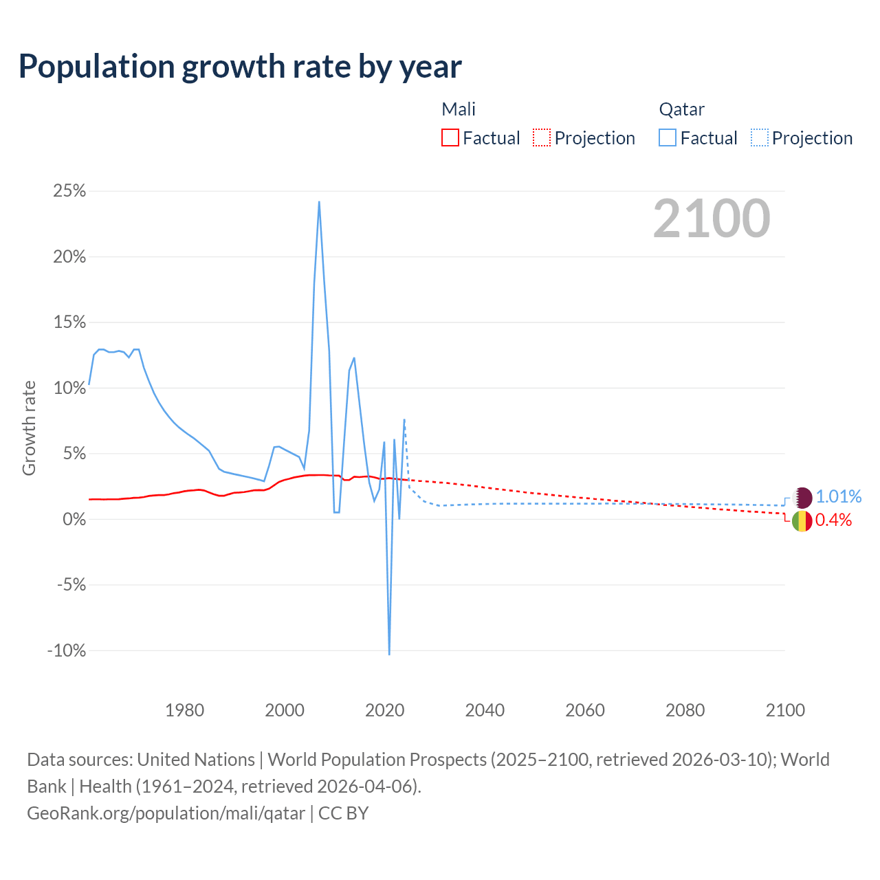 - For the last 10 years, Mali has had an average growth rate of +3.12% per year vs +3.86% in Qatar.