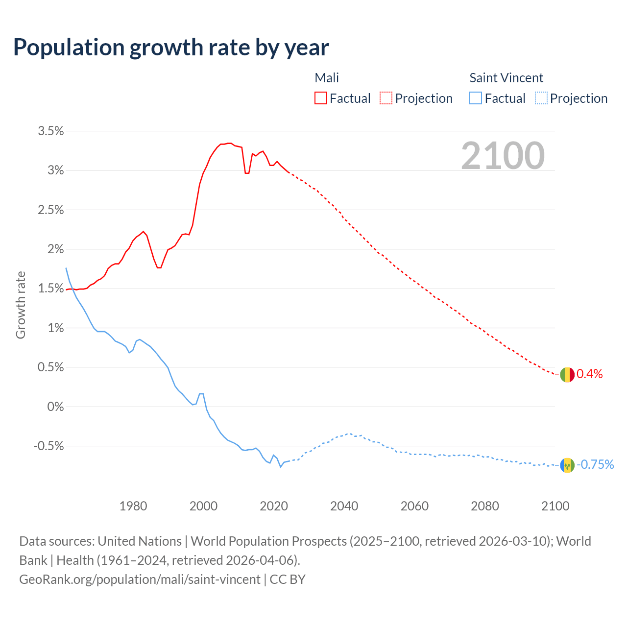 - For the last 10 years, Mali has had an average growth rate of +3.12% per year vs -0.65% in Saint Vincent.