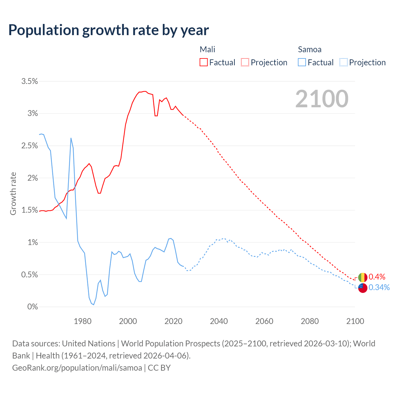 - For the last 10 years, Mali has had an average growth rate of +3.12% per year vs +0.87% in Samoa.