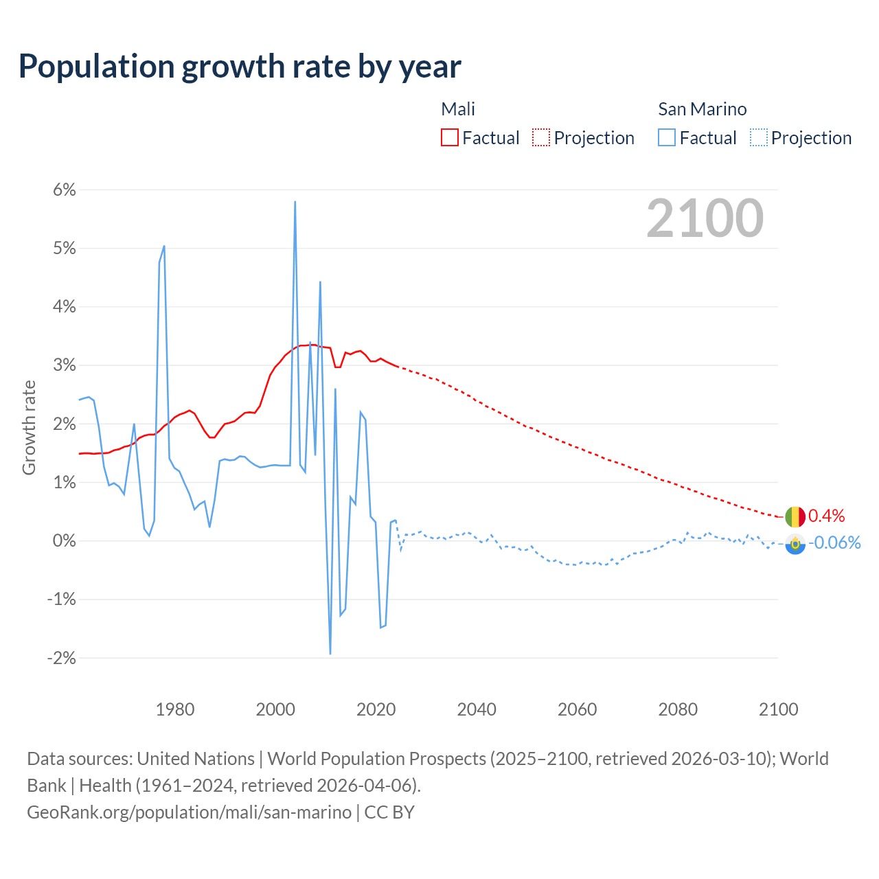 - For the last 10 years, Mali has had an average growth rate of +3.12% per year vs +0.26% in San Marino.