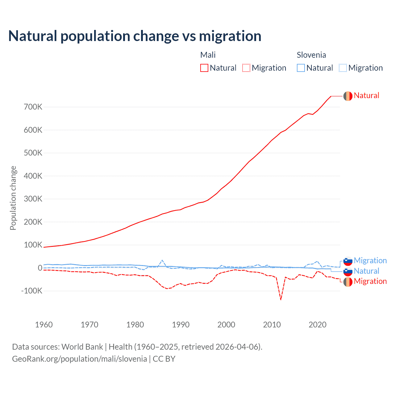 Over the last 10 years, 94.9% of the population change in Mali is from natural causes (a gain of 6,749,473 people) and 5.13% is from migration (a loss of 365,292 people). In Slovenia 18.1% is from natural causes (a loss of 17,573 people) and 81.9% is from migration (a gain of 79,532 people).