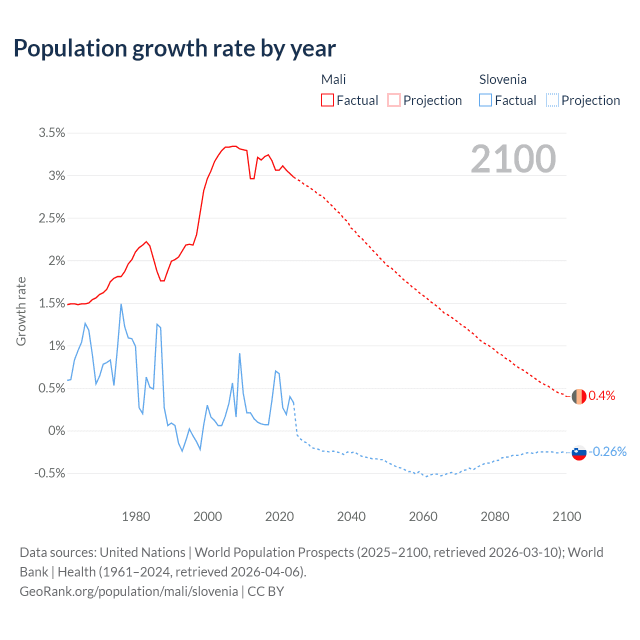 - For the last 10 years, Mali has had an average growth rate of +3.12% per year vs +0.29% in Slovenia.
