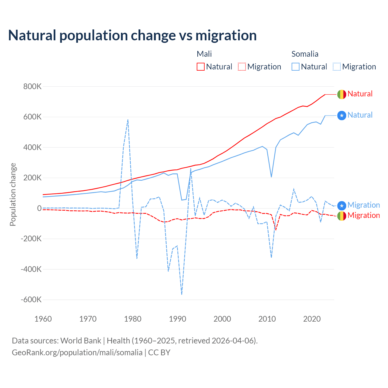 Over the last 10 years, 94.9% of the population change in Mali is from natural causes (a gain of 6,749,473 people) and 5.13% is from migration (a loss of 365,292 people). In Somalia 94.4% is from natural causes (a gain of 5,270,105 people) and 5.58% is from migration (a gain of 311,487 people).