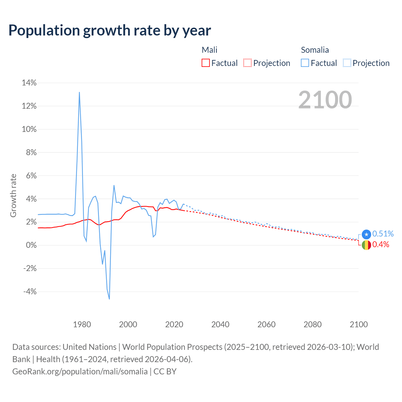 - For the last 10 years, Mali has had an average growth rate of +3.12% per year vs +3.61% in Somalia.