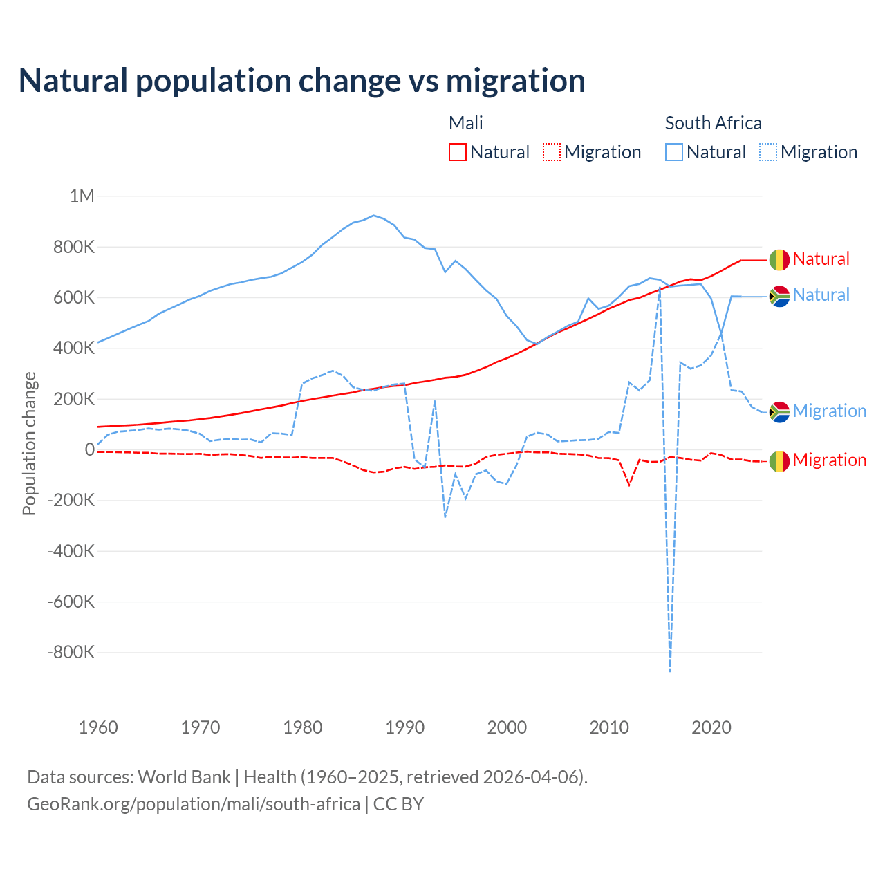Over the last 10 years, 94.9% of the population change in Mali is from natural causes (a gain of 6,749,473 people) and 5.13% is from migration (a loss of 365,292 people). In South Africa 72.8% is from natural causes (a gain of 6,190,027 people) and 27.2% is from migration (a gain of 2,316,795 people).