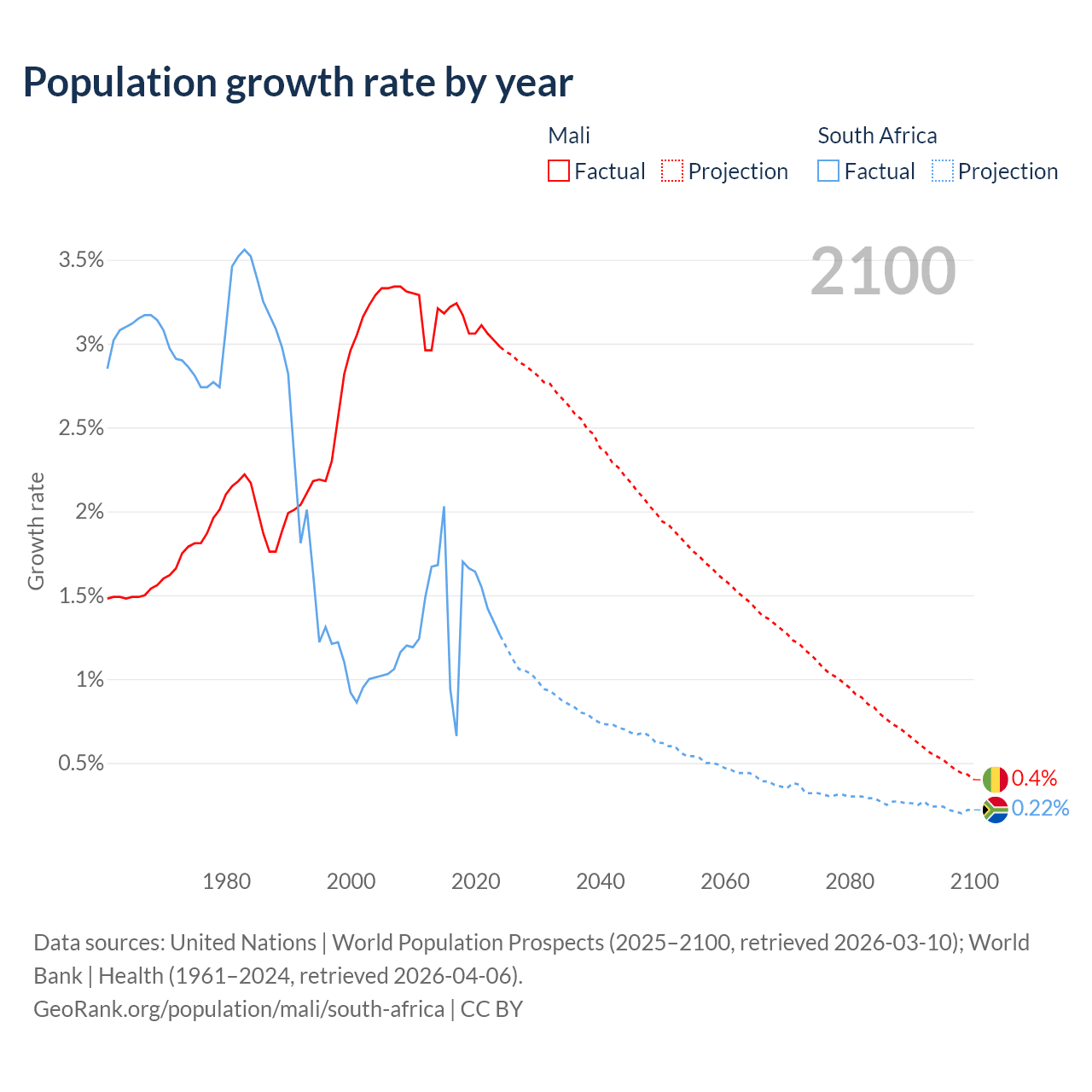 - For the last 10 years, Mali has had an average growth rate of +3.12% per year vs +1.44% in South Africa.