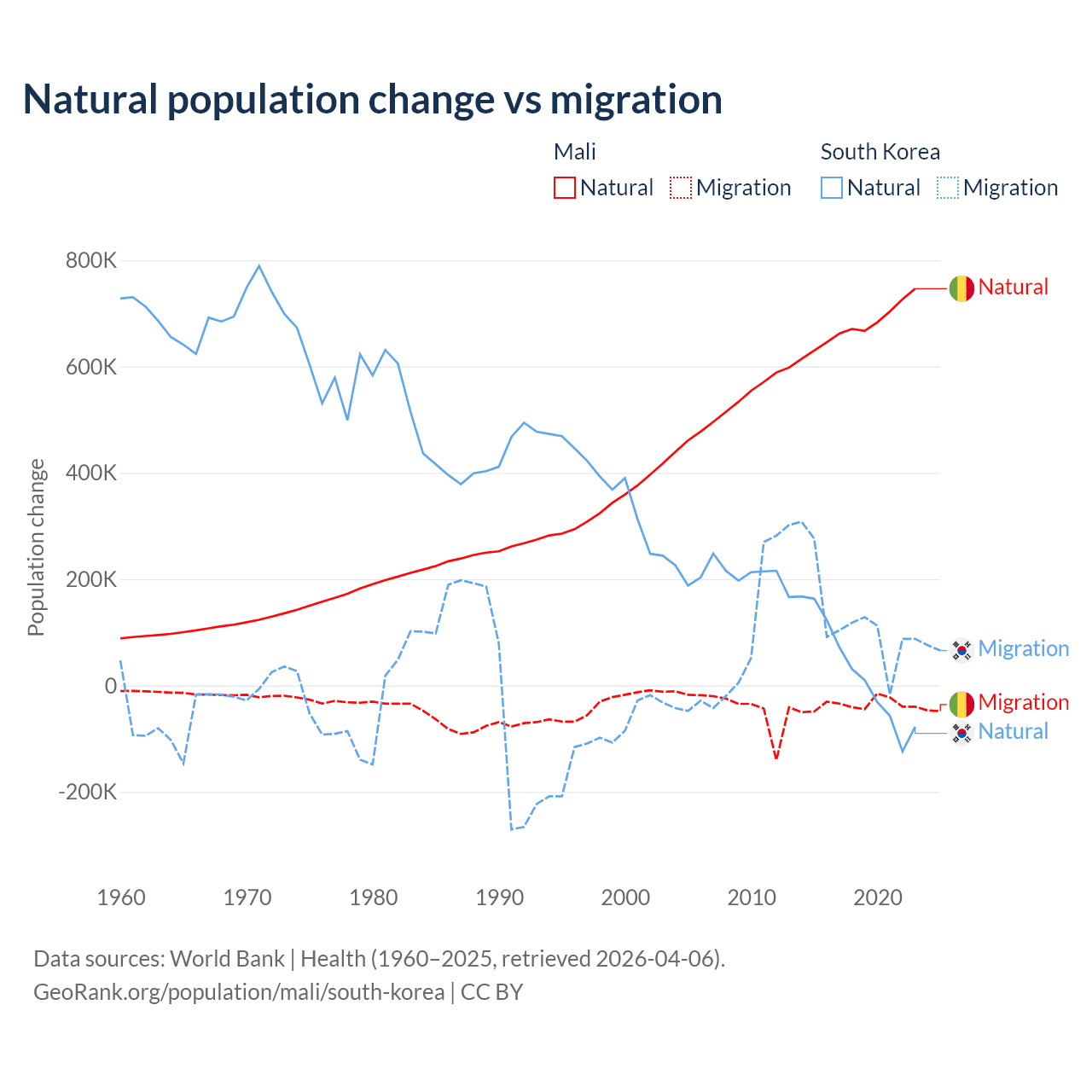 Over the last 10 years, 94.9% of the population change in Mali is from natural causes (a gain of 6,749,473 people) and 5.13% is from migration (a loss of 365,292 people). In South Korea 17.6% is from natural causes (a gain of 277,215 people) and 82.4% is from migration (a gain of 1,298,356 people).