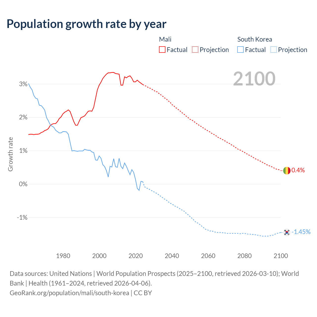 - For the last 10 years, Mali has had an average growth rate of +3.12% per year vs +0.24% in South Korea.