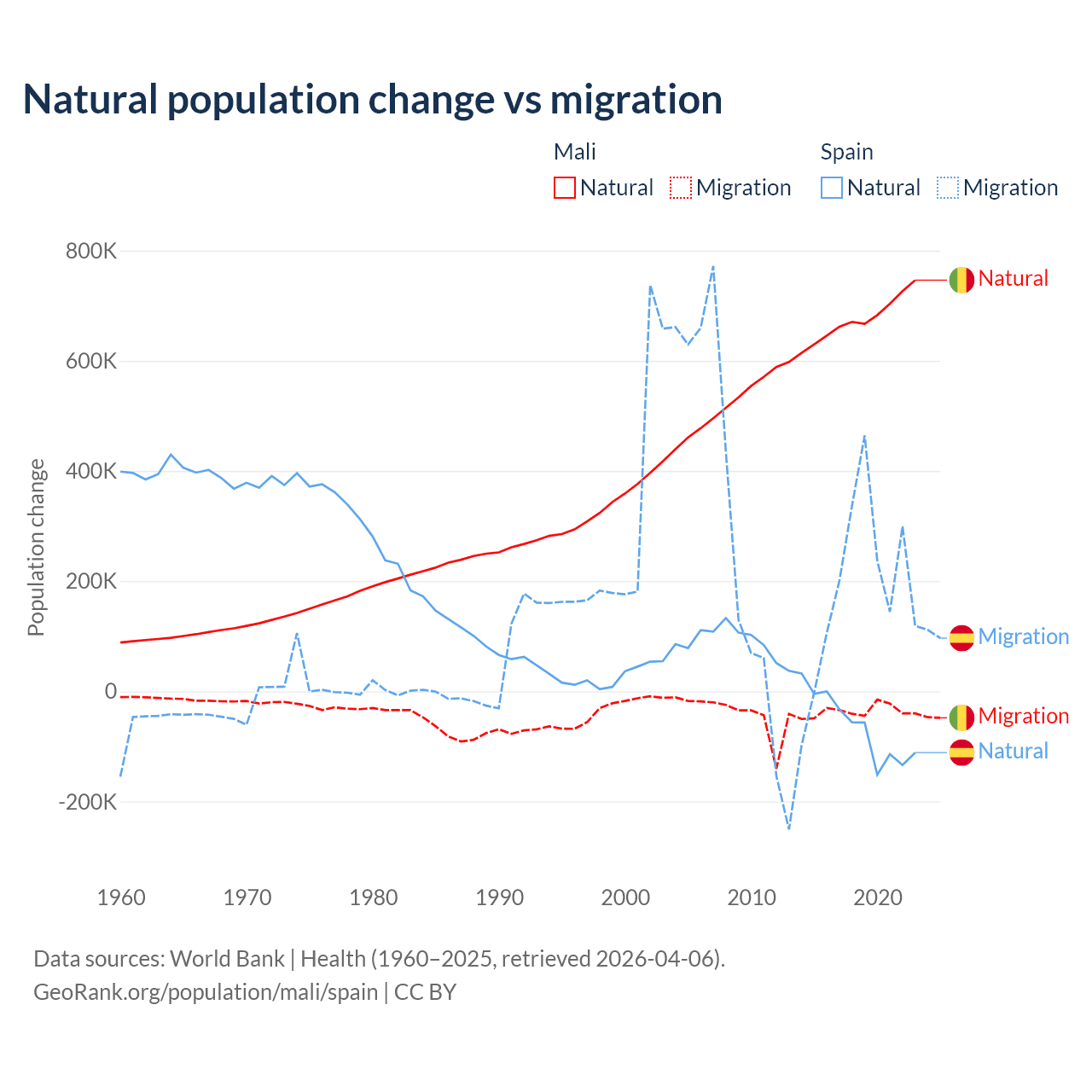 Over the last 10 years, 94.9% of the population change in Mali is from natural causes (a gain of 6,749,473 people) and 5.13% is from migration (a loss of 365,292 people). In Spain 25.8% is from natural causes (a loss of 627,829 people) and 74.2% is from migration (a gain of 1,810,127 people).