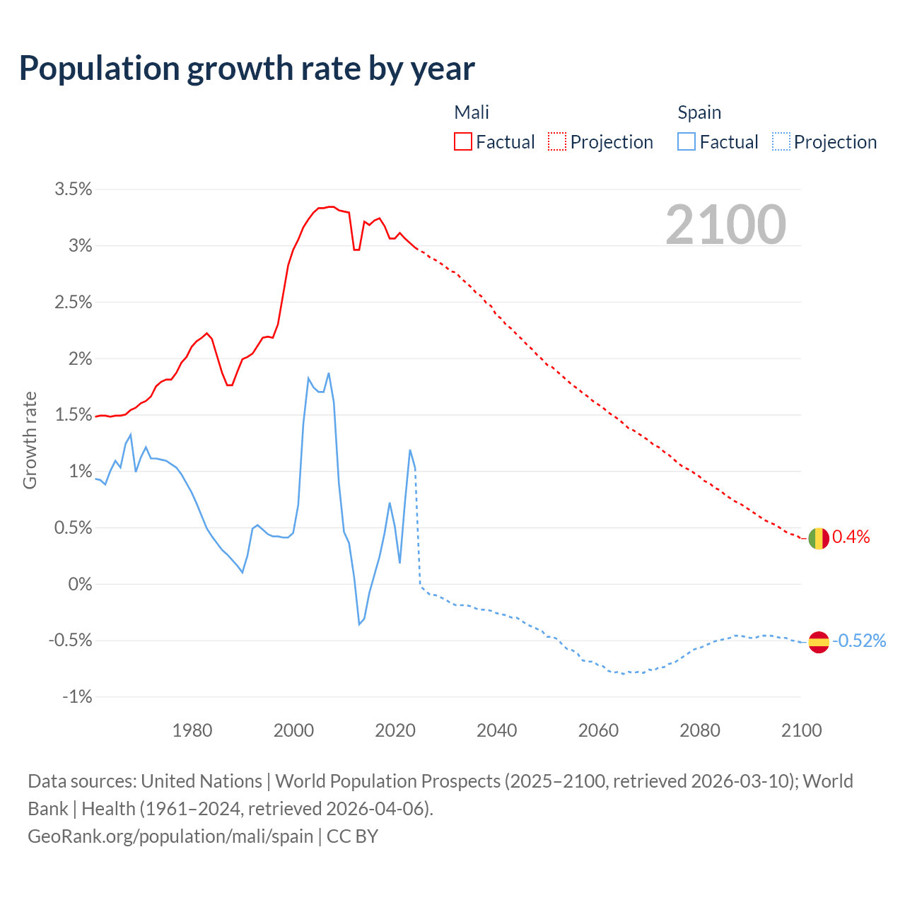 - For the last 10 years, Mali has had an average growth rate of +3.12% per year vs +0.43% in Spain.