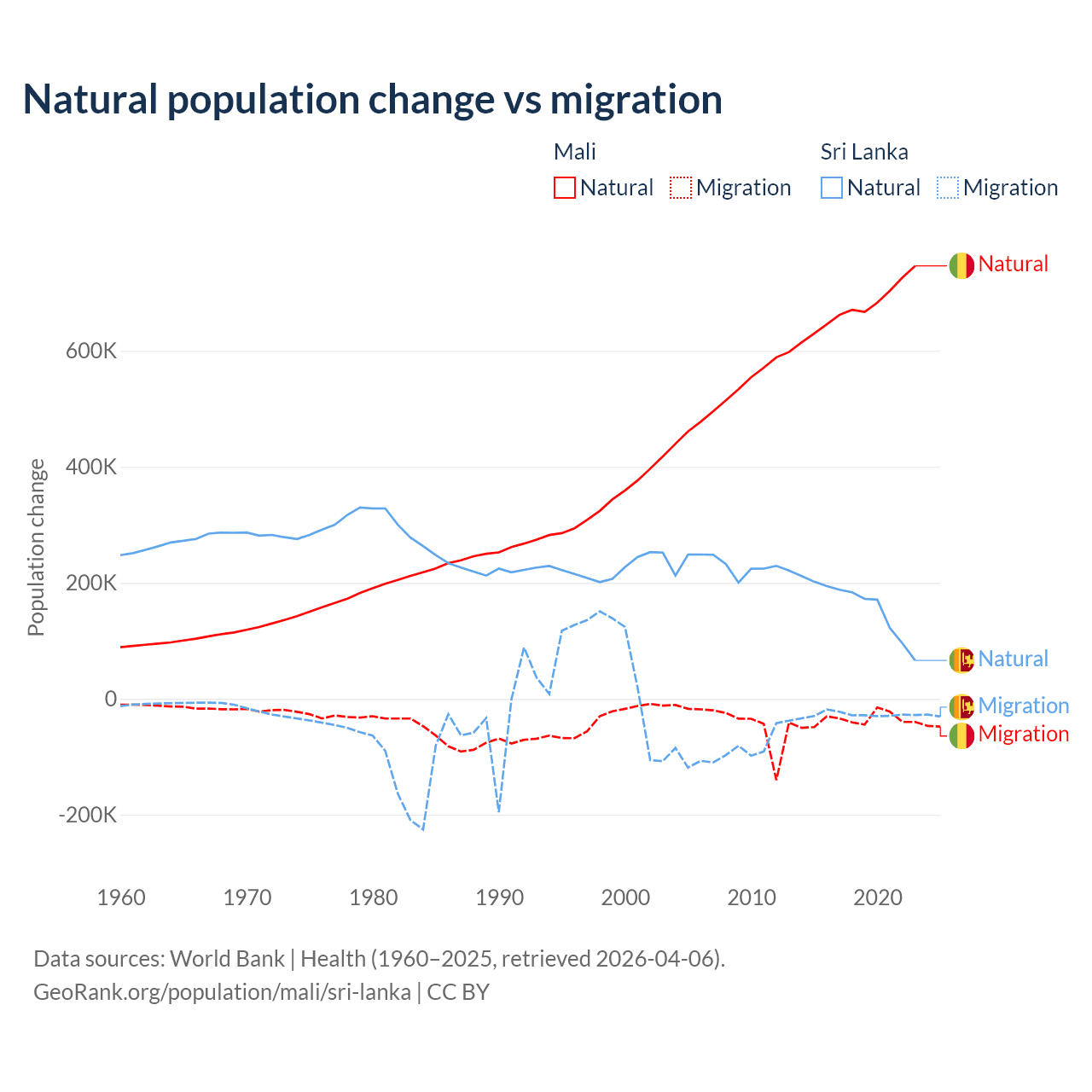 Over the last 10 years, 94.9% of the population change in Mali is from natural causes (a gain of 6,749,473 people) and 5.13% is from migration (a loss of 365,292 people). In Sri Lanka 85.3% is from natural causes (a gain of 1,605,749 people) and 14.7% is from migration (a loss of 276,121 people).