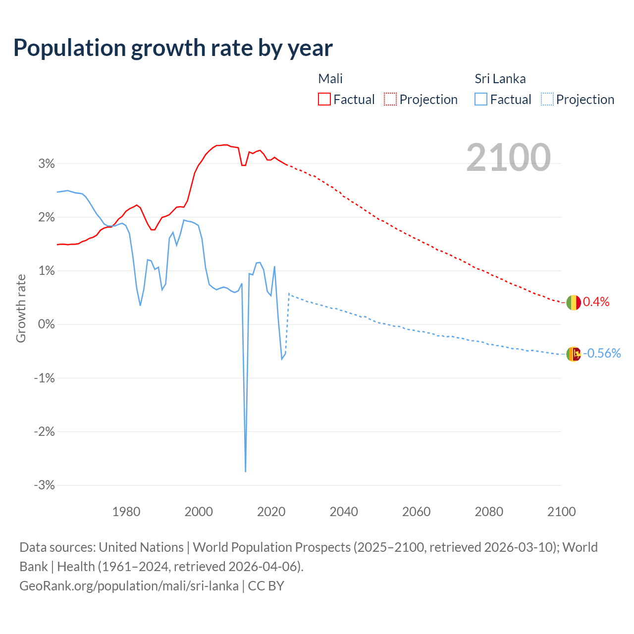- For the last 10 years, Mali has had an average growth rate of +3.12% per year vs +0.57% in Sri Lanka.