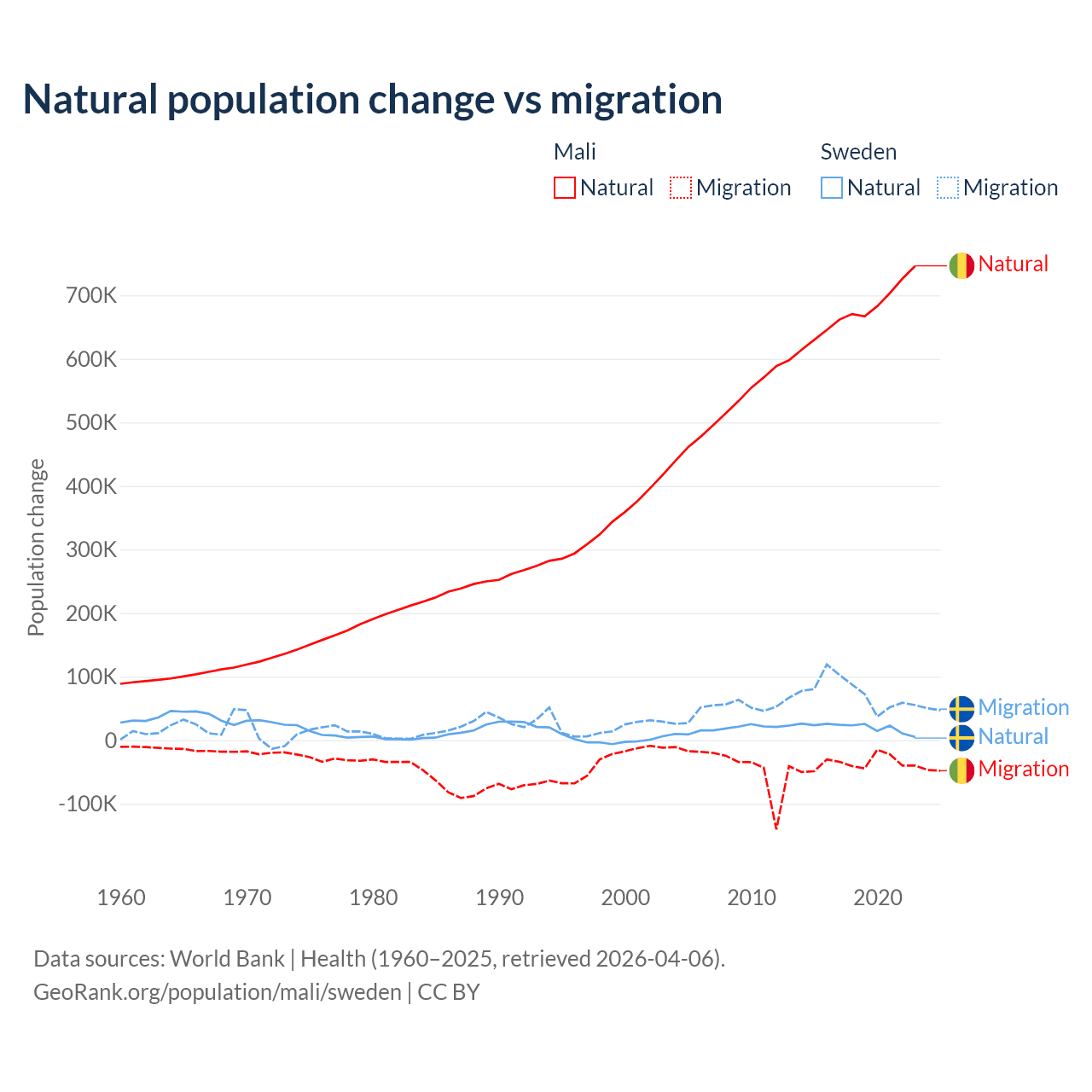 Over the last 10 years, 94.9% of the population change in Mali is from natural causes (a gain of 6,749,473 people) and 5.13% is from migration (a loss of 365,292 people). In Sweden 21.4% is from natural causes (a gain of 201,900 people) and 78.6% is from migration (a gain of 743,642 people).