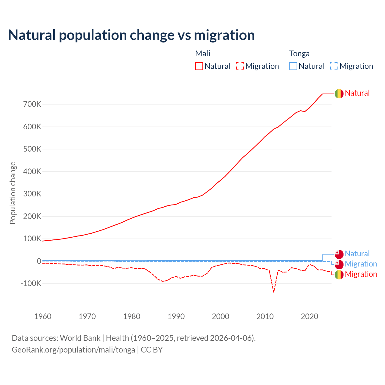 Over the last 10 years, 94.9% of the population change in Mali is from natural causes (a gain of 6,749,473 people) and 5.13% is from migration (a loss of 365,292 people). In Tonga 46.9% is from natural causes (a gain of 18,919 people) and 53.1% is from migration (a loss of 21,384 people).