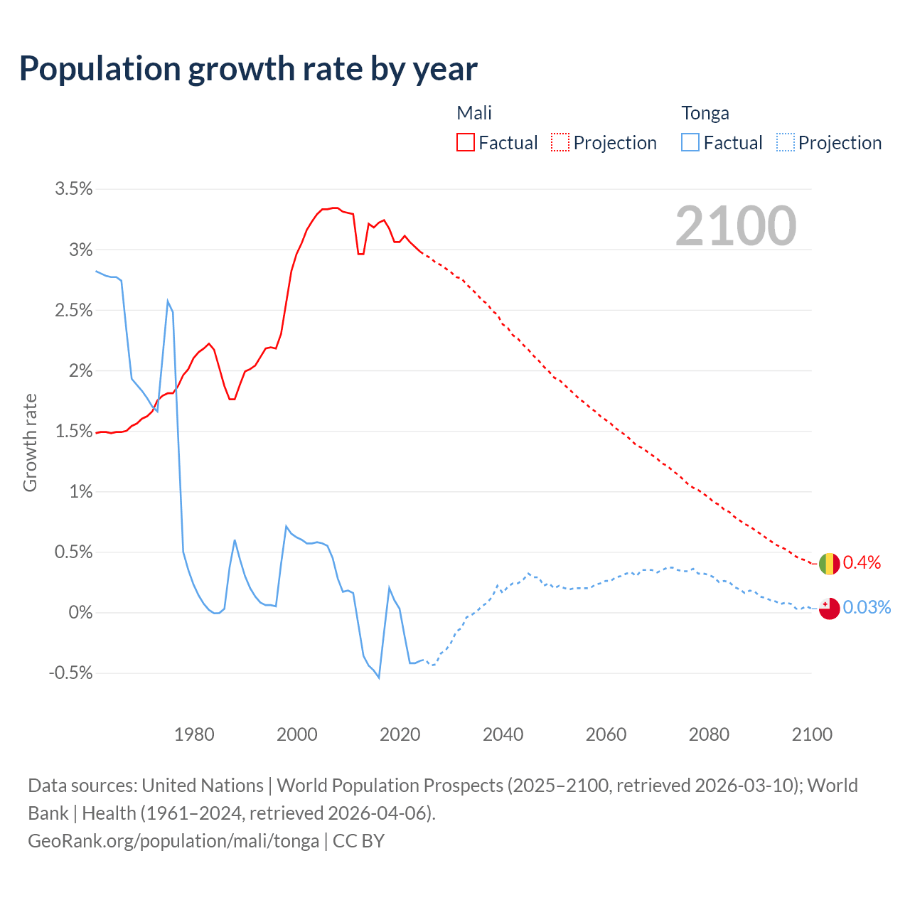 - For the last 10 years, Mali has had an average growth rate of +3.12% per year vs -0.25% in Tonga.