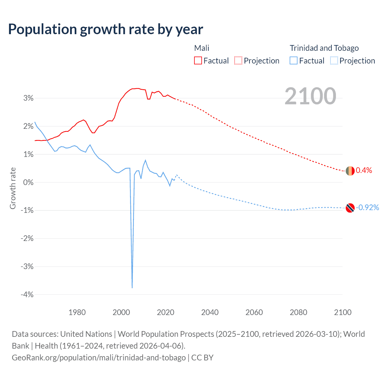 - For the last 10 years, Mali has had an average growth rate of +3.12% per year vs +0.19% in Trinidad and Tobago.