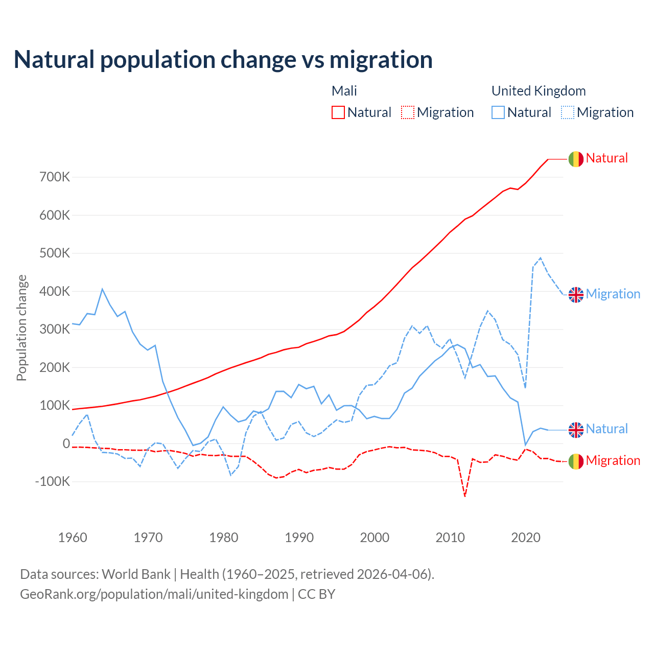 Over the last 10 years, 94.9% of the population change in Mali is from natural causes (a gain of 6,749,473 people) and 5.13% is from migration (a loss of 365,292 people). In the United Kingdom 23.9% is from natural causes (a gain of 1,033,129 people) and 76.1% is from migration (a gain of 3,283,101 people).