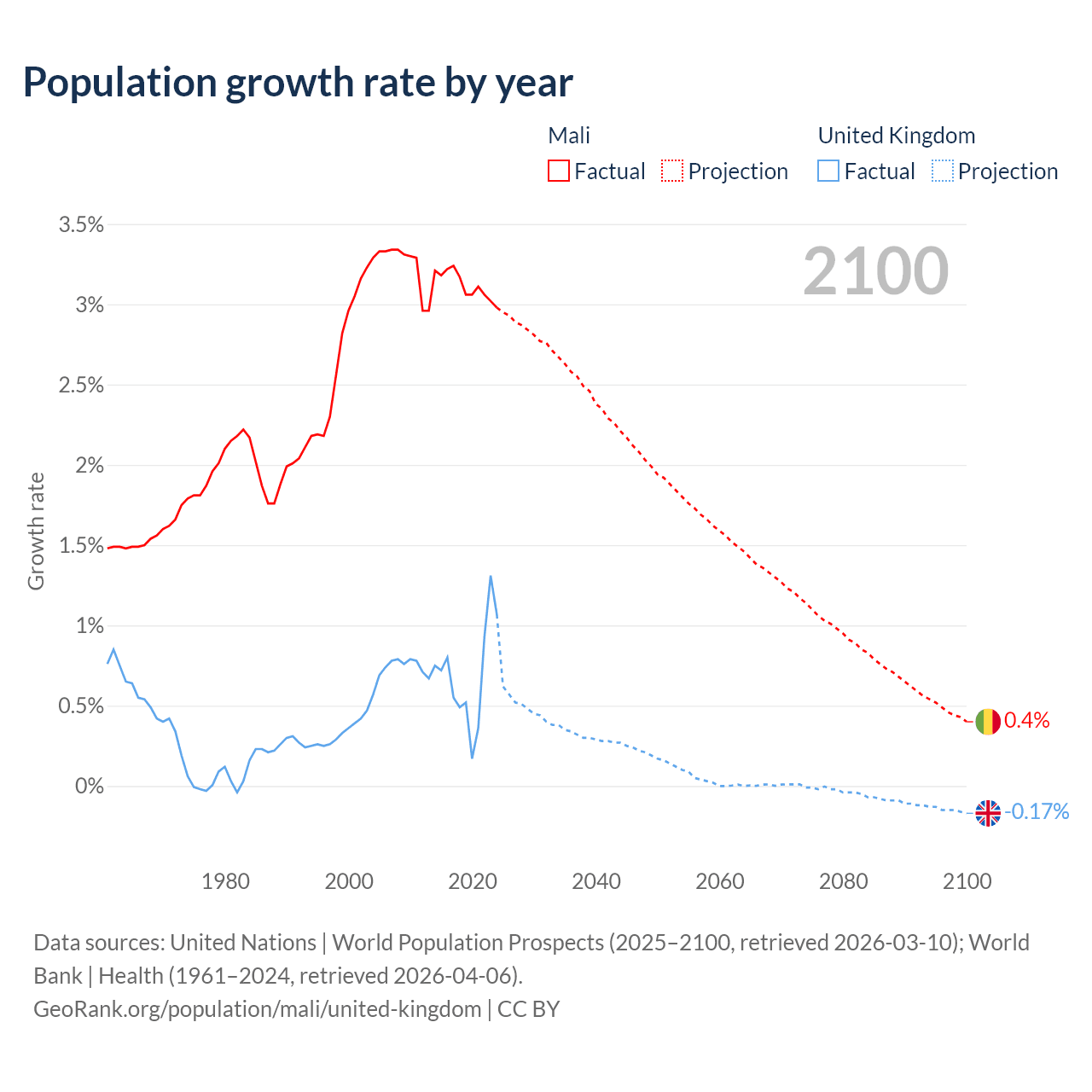 - For the last 10 years, Mali has had an average growth rate of +3.12% per year vs +0.7% in the United Kingdom.