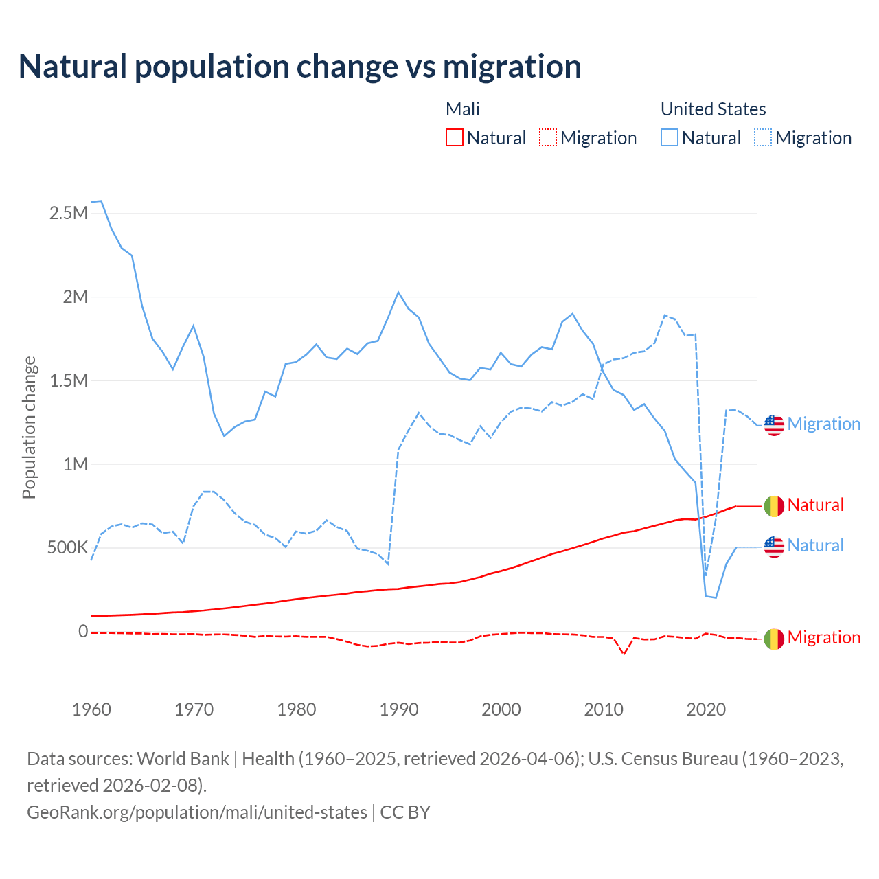 Over the last 10 years, 94.9% of the population change in Mali is from natural causes (a gain of 6,749,473 people) and 5.13% is from migration (a loss of 365,292 people). In the United States 35.8% is from natural causes (a gain of 8,005,866 people) and 64.2% is from migration (a gain of 14,334,286 people).