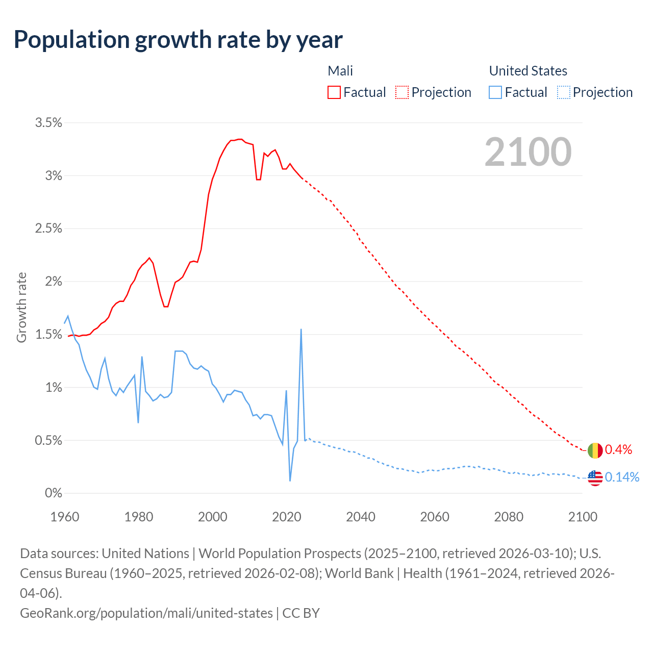 - For the last 10 years, Mali has had an average growth rate of +3.12% per year vs +0.65% in the United States.