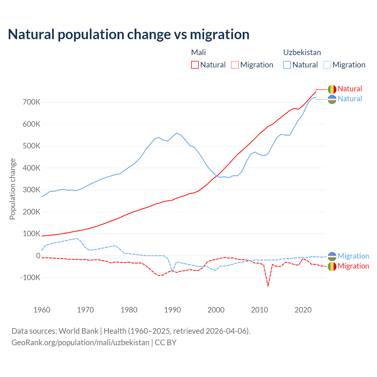 Over the last 10 years, 94.9% of the population change in Mali is from natural causes (a gain of 6,749,473 people) and 5.13% is from migration (a loss of 365,292 people). In Uzbekistan 98.2% is from natural causes (a gain of 6,161,117 people) and 1.84% is from migration (a loss of 115,398 people).