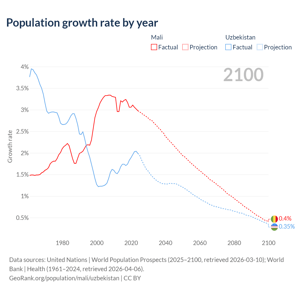 - For the last 10 years, Mali has had an average growth rate of +3.12% per year vs +1.85% in Uzbekistan.