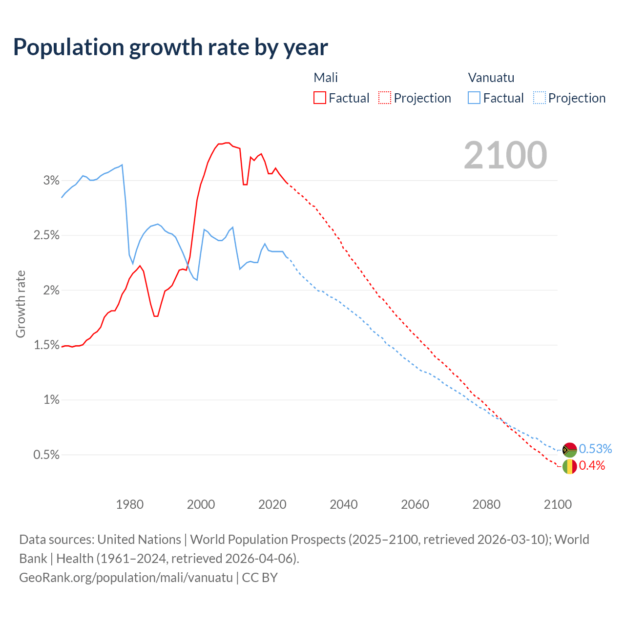 - For the last 10 years, Mali has had an average growth rate of +3.12% per year vs +2.33% in Vanuatu.