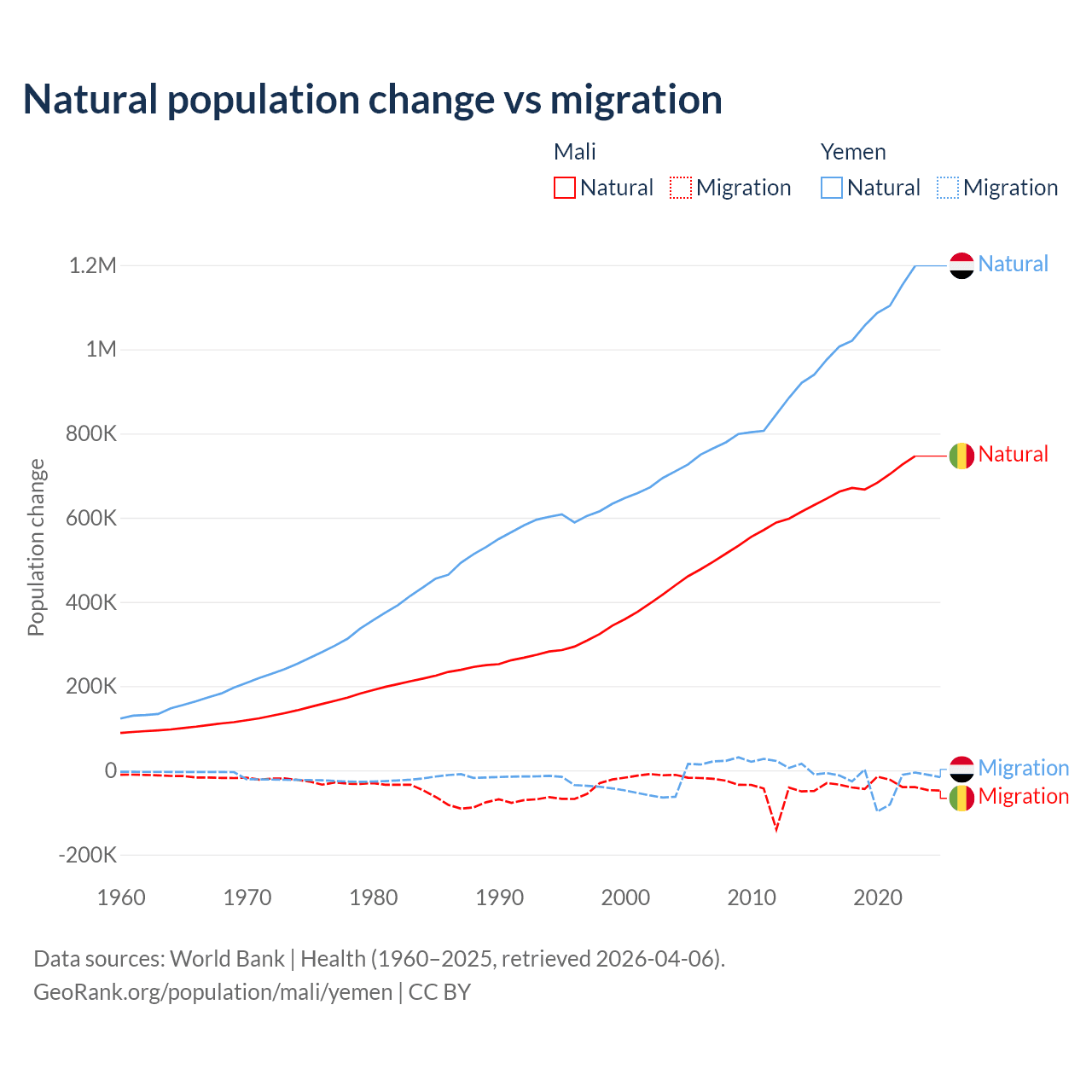 Over the last 10 years, 94.9% of the population change in Mali is from natural causes (a gain of 6,749,473 people) and 5.13% is from migration (a loss of 365,292 people). In Yemen 97.8% is from natural causes (a gain of 10,460,813 people) and 2.17% is from migration (a loss of 231,814 people).