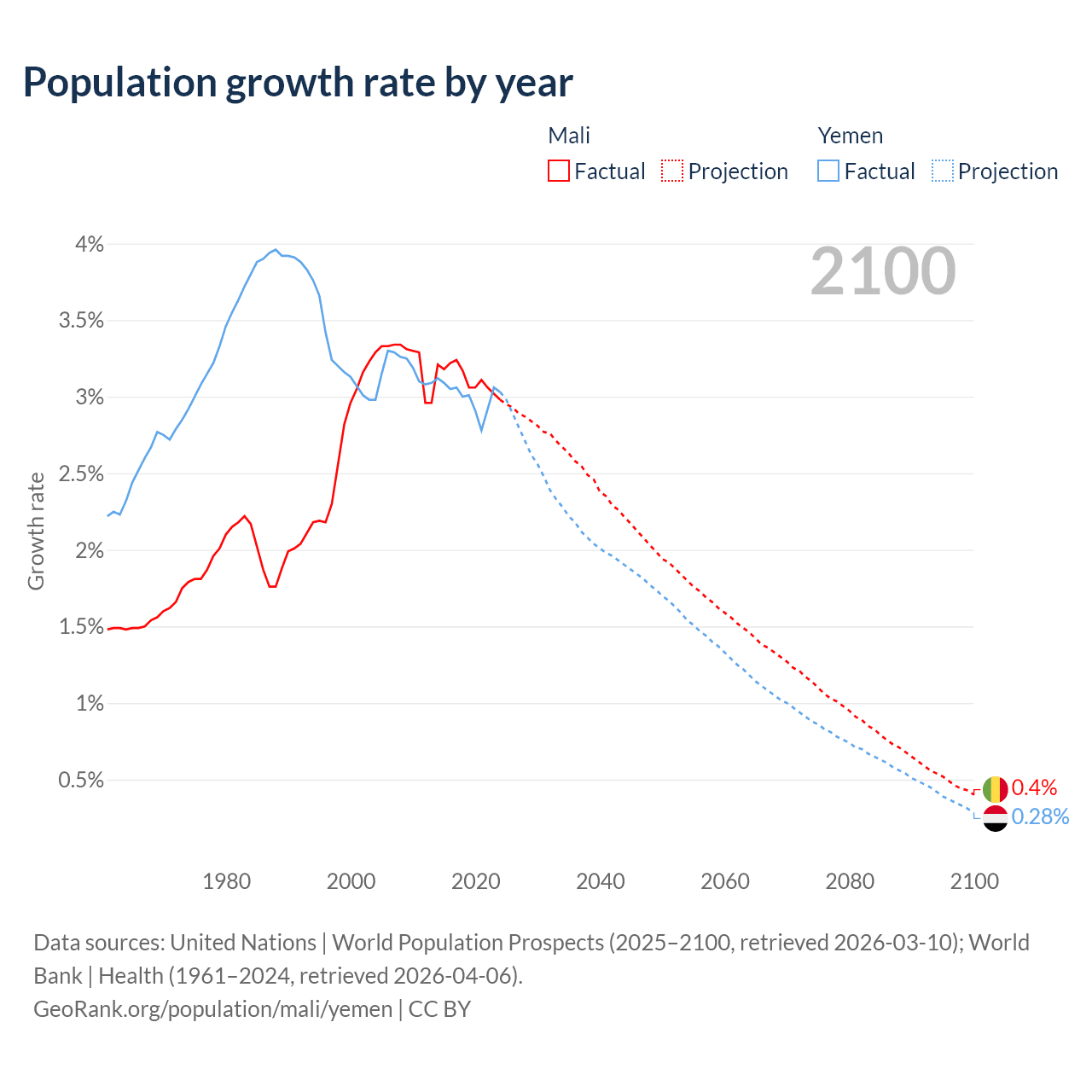 - For the last 10 years, Mali has had an average growth rate of +3.12% per year vs +3% in Yemen.
