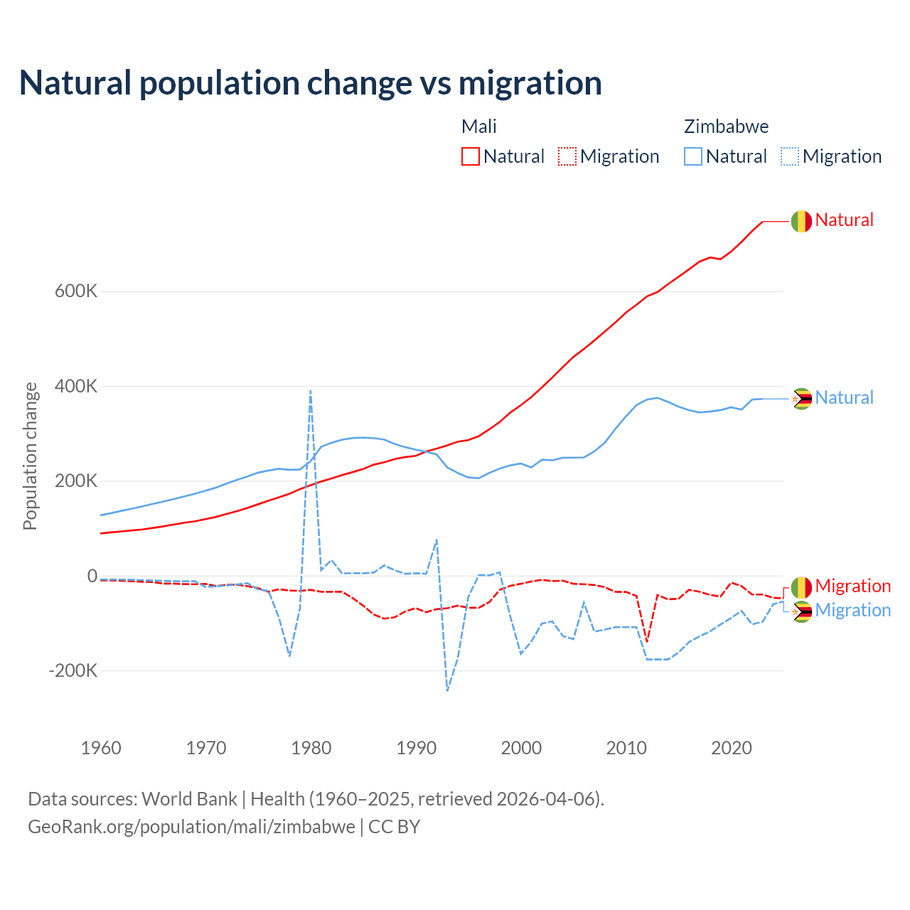 Over the last 10 years, 94.9% of the population change in Mali is from natural causes (a gain of 6,749,473 people) and 5.13% is from migration (a loss of 365,292 people). In Zimbabwe 74.9% is from natural causes (a gain of 3,558,487 people) and 25.1% is from migration (a loss of 1,192,807 people).