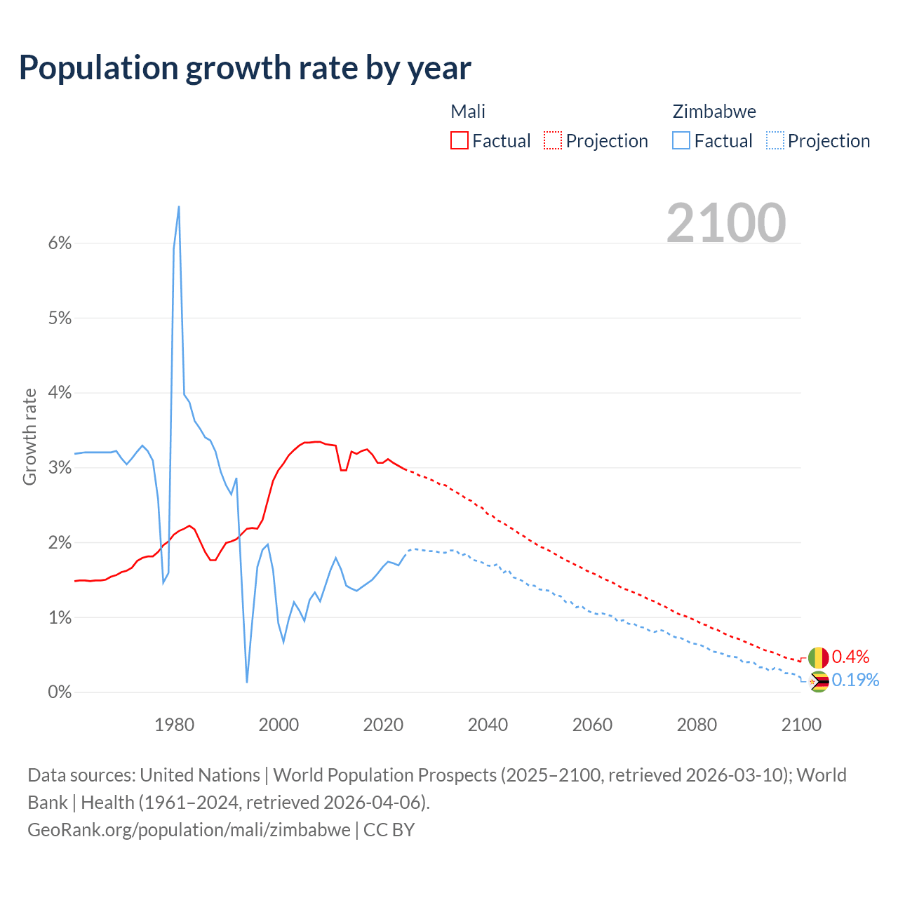 - For the last 10 years, Mali has had an average growth rate of +3.12% per year vs +1.57% in Zimbabwe.