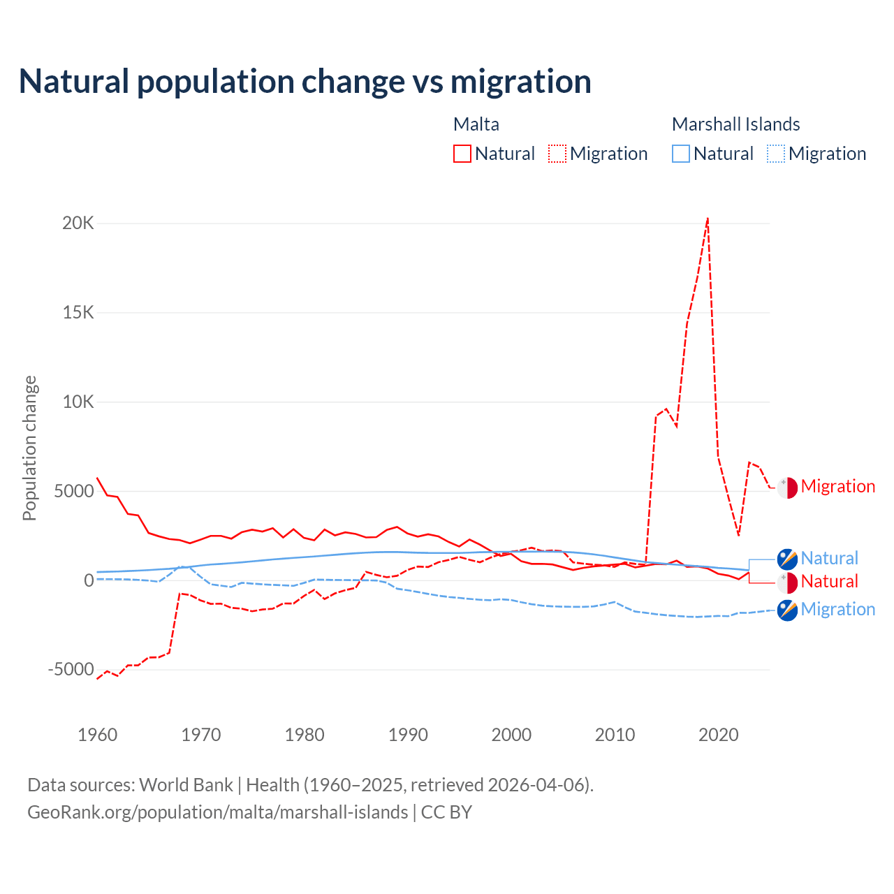 Over the last 10 years, 5.84% of the population change in Malta is from natural causes (a gain of 6,181 people) and 94.2% is from migration (a gain of 99,652 people). In the Marshall Islands 27.8% is from natural causes (a gain of 7,592 people) and 72.2% is from migration (a loss of 19,682 people).