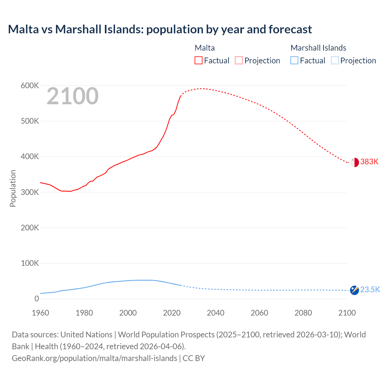 - Malta's population is 16.6 times bigger than the Marshall Islands'.