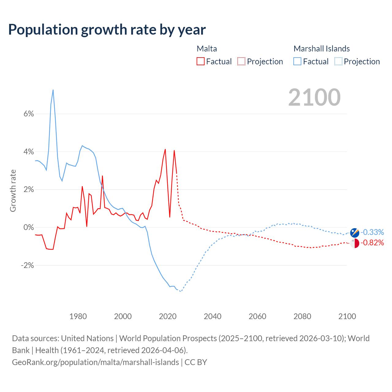 - Since 2006, the population of Malta has increased from 405K people to 582K (43.5% growth), while the Marshall Islands has declined from 52K to 35.1K (32.6% decline).