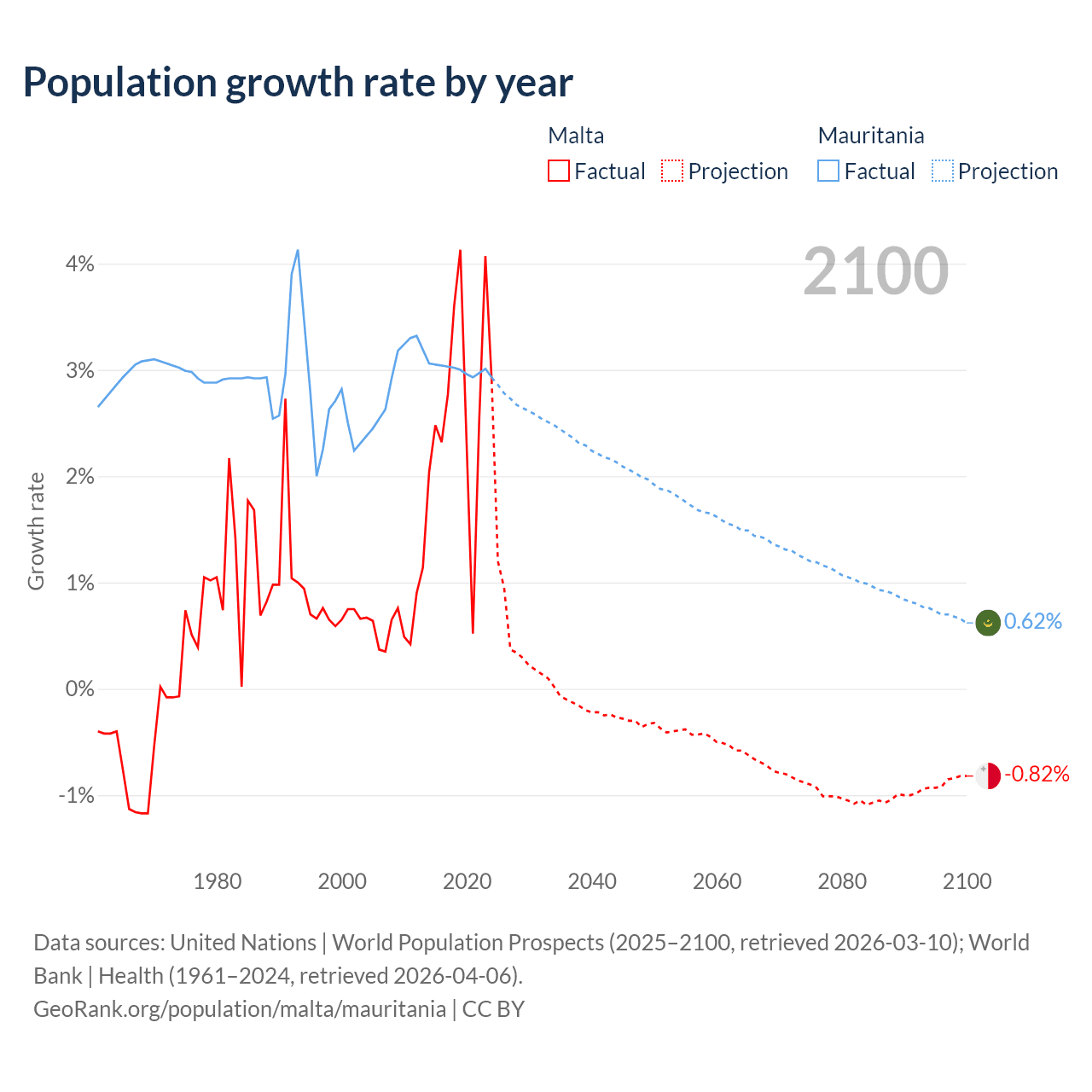 - For the last 10 years, Malta has had an average growth rate of +2.69% per year vs +3% in Mauritania.