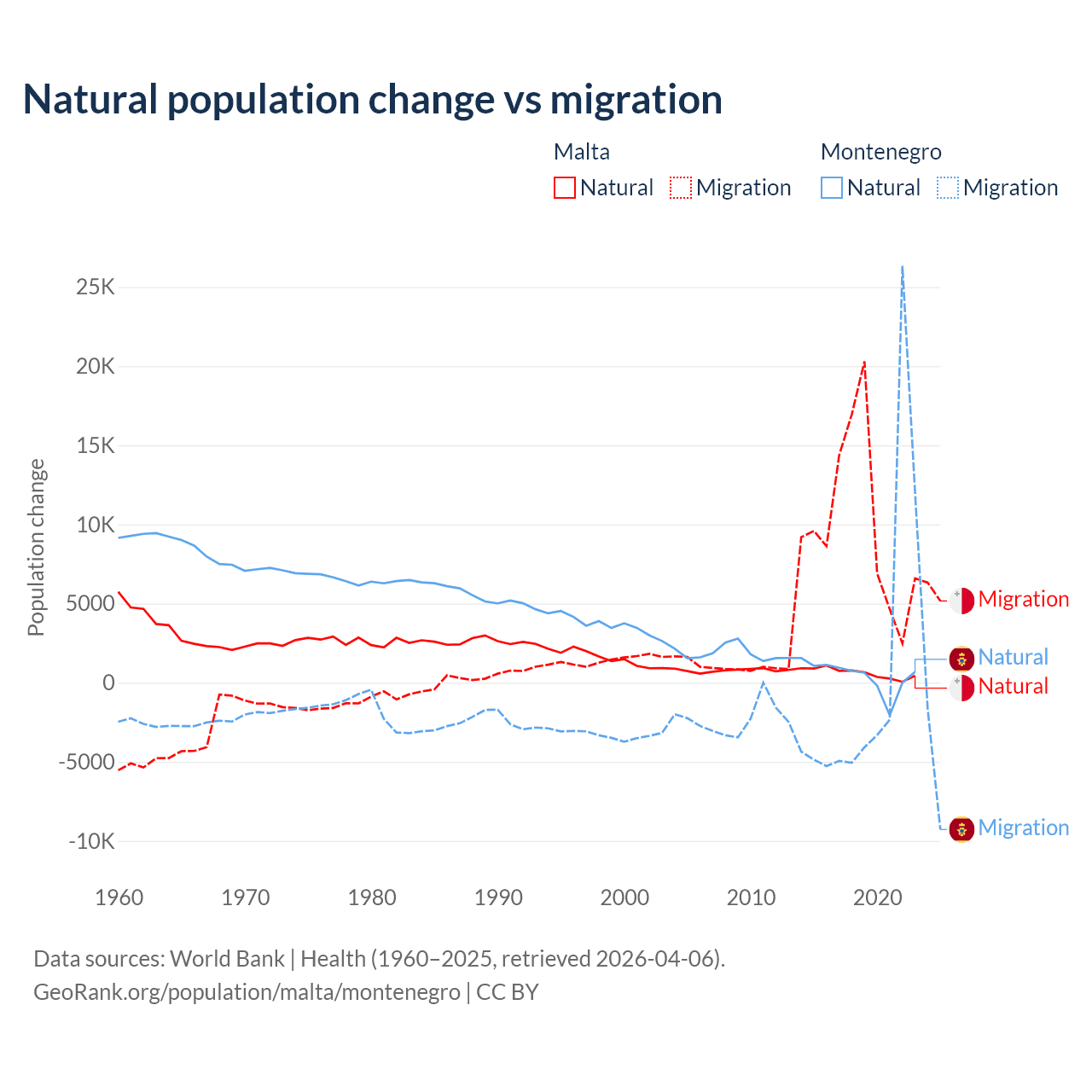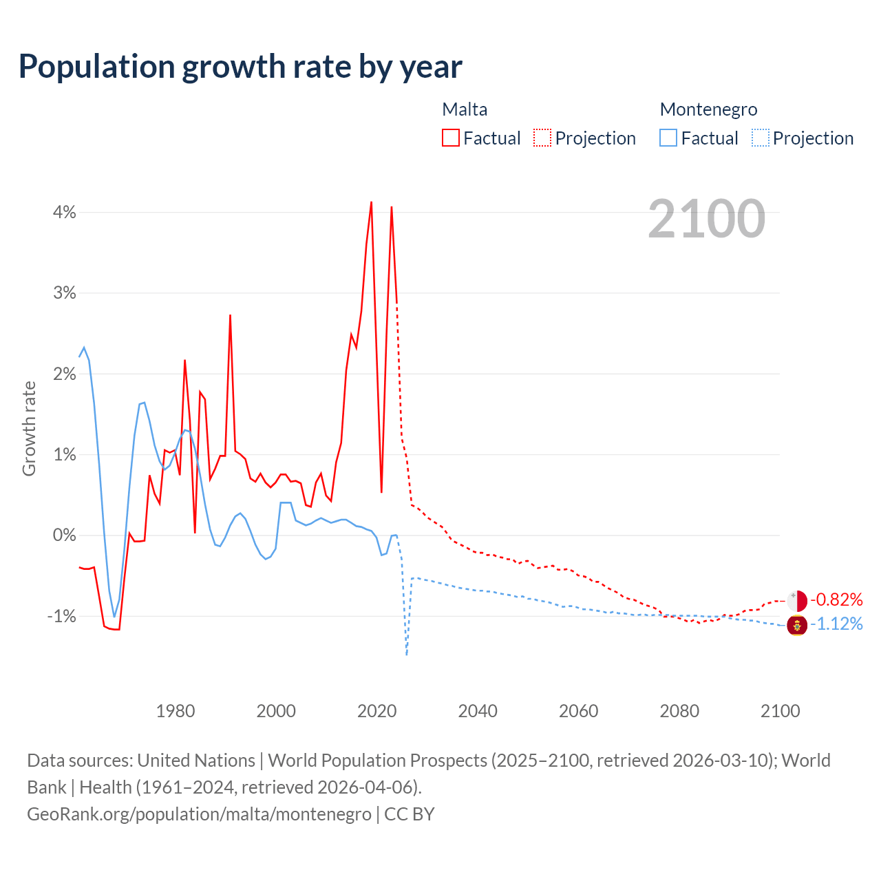 - Since 2006, the population of Malta has increased from 405K people to 582K (43.5% growth), while Montenegro has declined from 615K to 612K (0.44% decline).