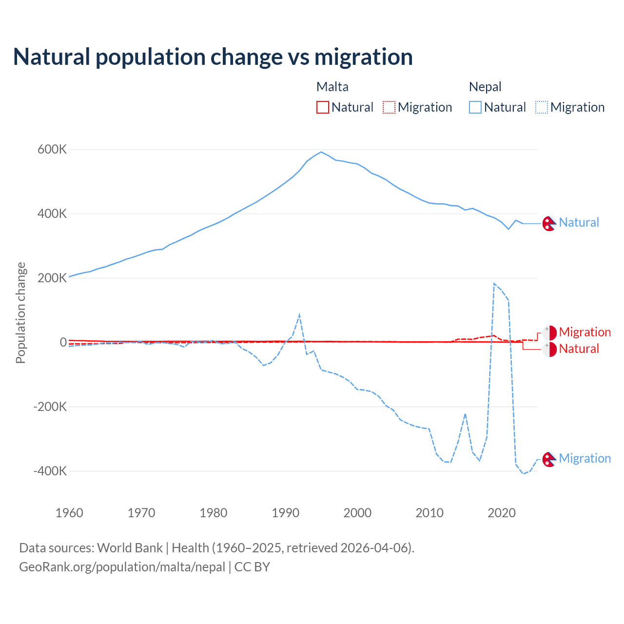 Over the last 10 years, 5.84% of the population change in Malta is from natural causes (a gain of 6,181 people) and 94.2% is from migration (a gain of 99,652 people). In Nepal 67.9% is from natural causes (a gain of 3,909,749 people) and 32.1% is from migration (a loss of 1,851,664 people).