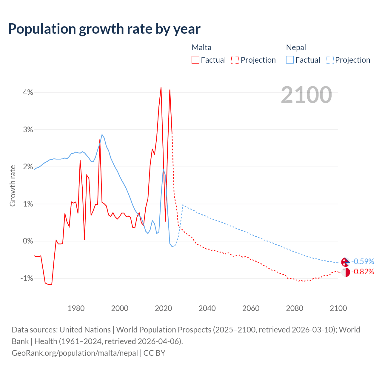 - For the last 10 years, Malta has had an average growth rate of +2.69% per year vs +0.66% in Nepal.